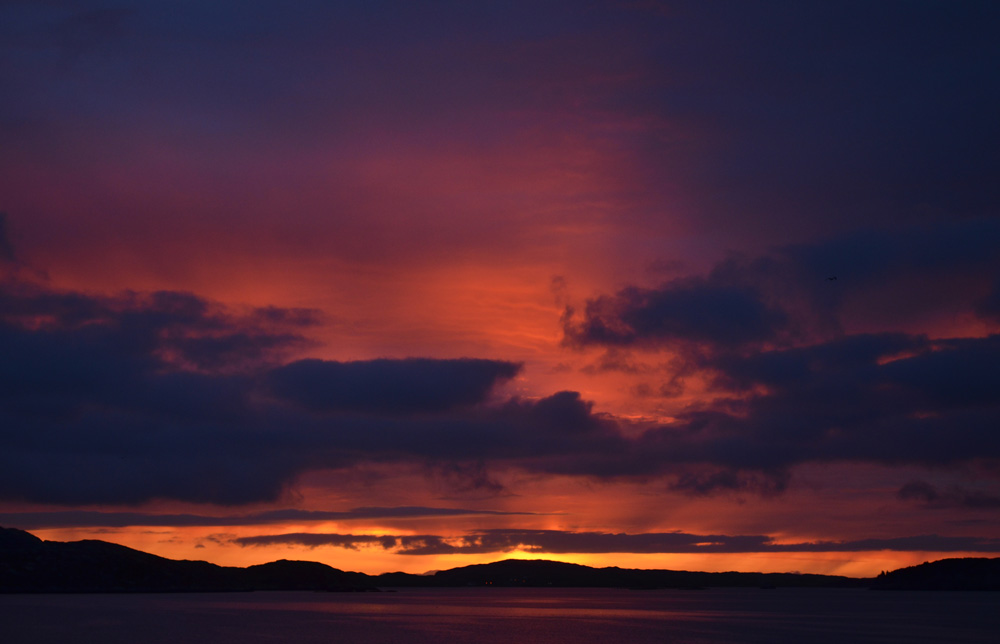 As the ferry pulled out of Tarbet, rain clouds gathered, leaving a rainbow over Harris and a spectacular fading sunrise as we sailed back towards Skye.