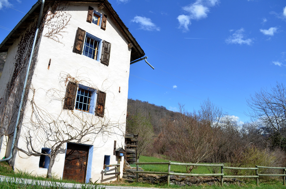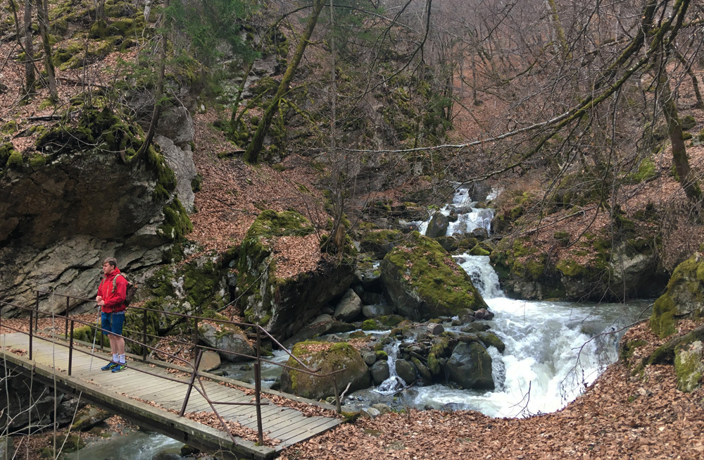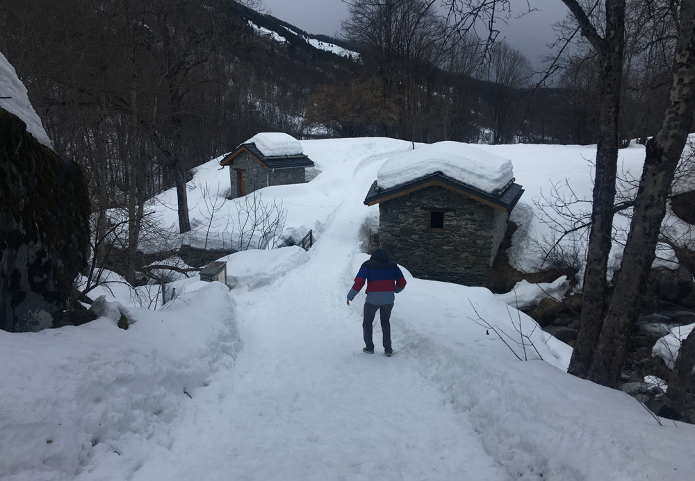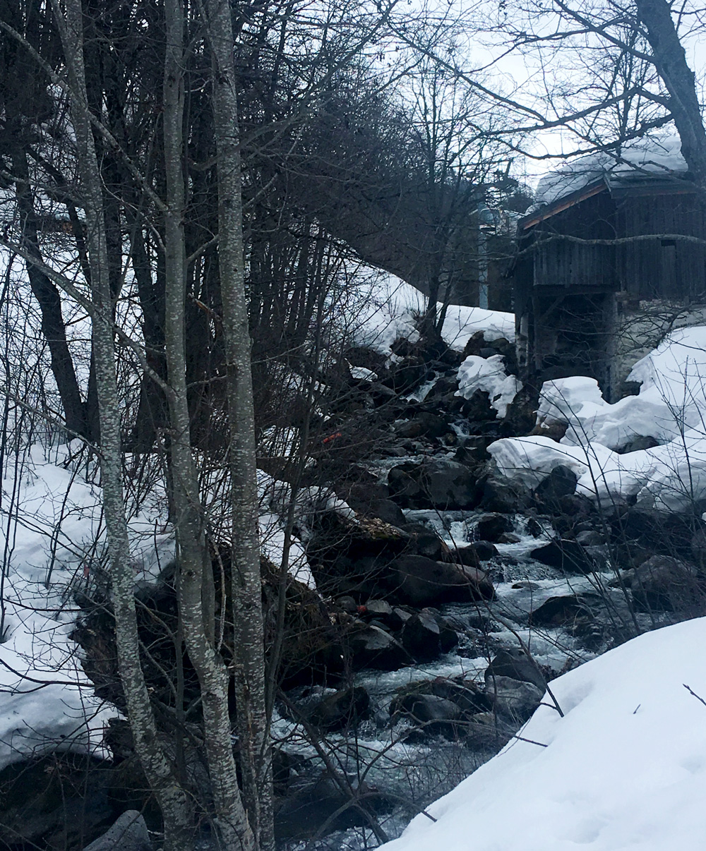 High winds can occasionally shut the lifts in Meribel, so one afternoon we took the bubble lift down to the pretty hamlet of Raffort for a walk along the river to an old water mill site. (B was wearing his Vans, hence the funny walking ha!).