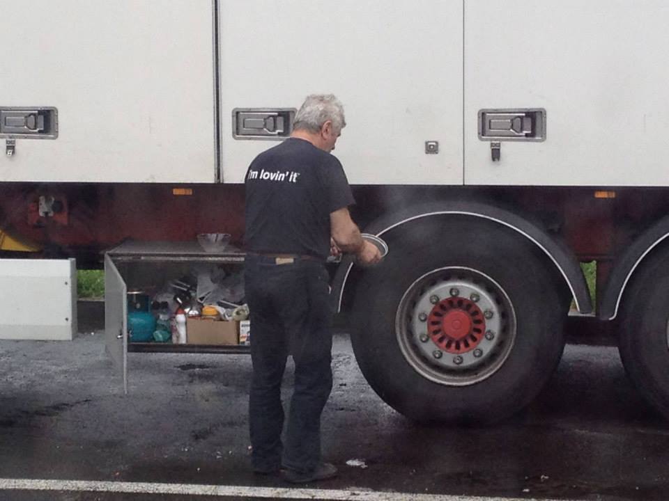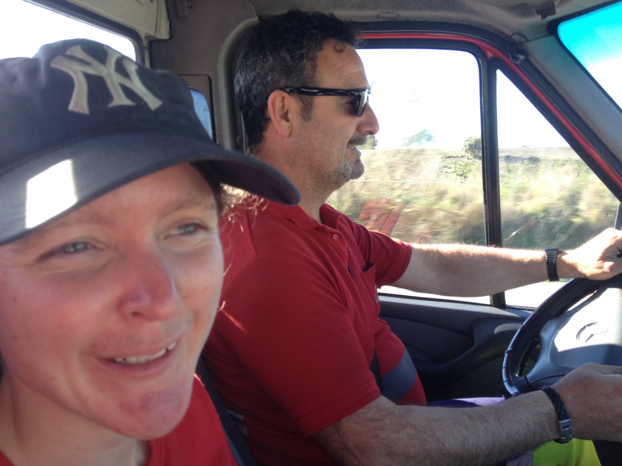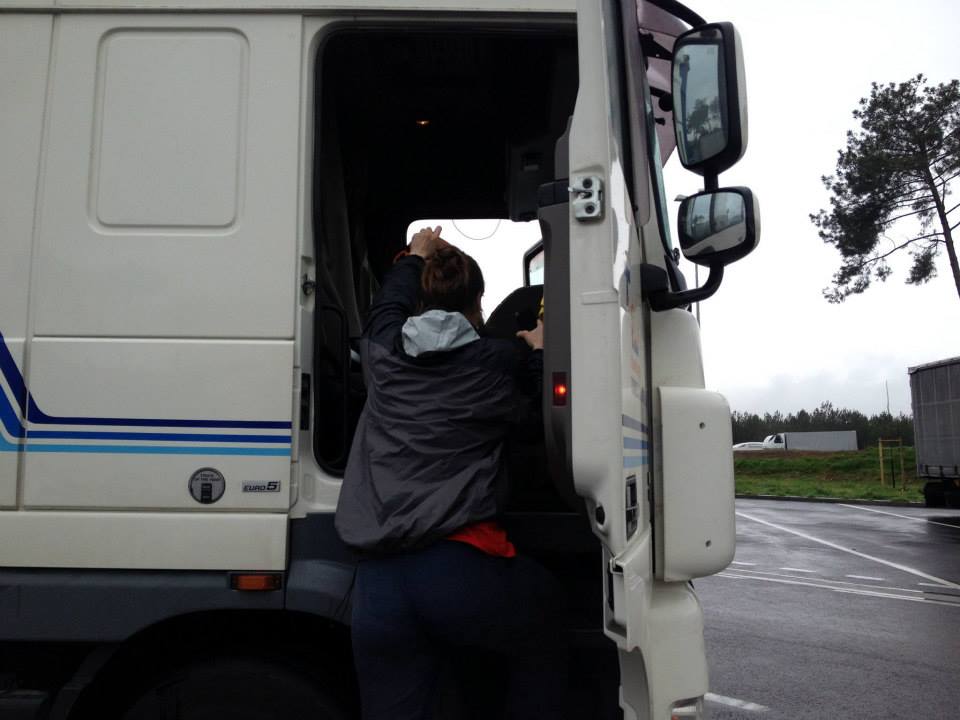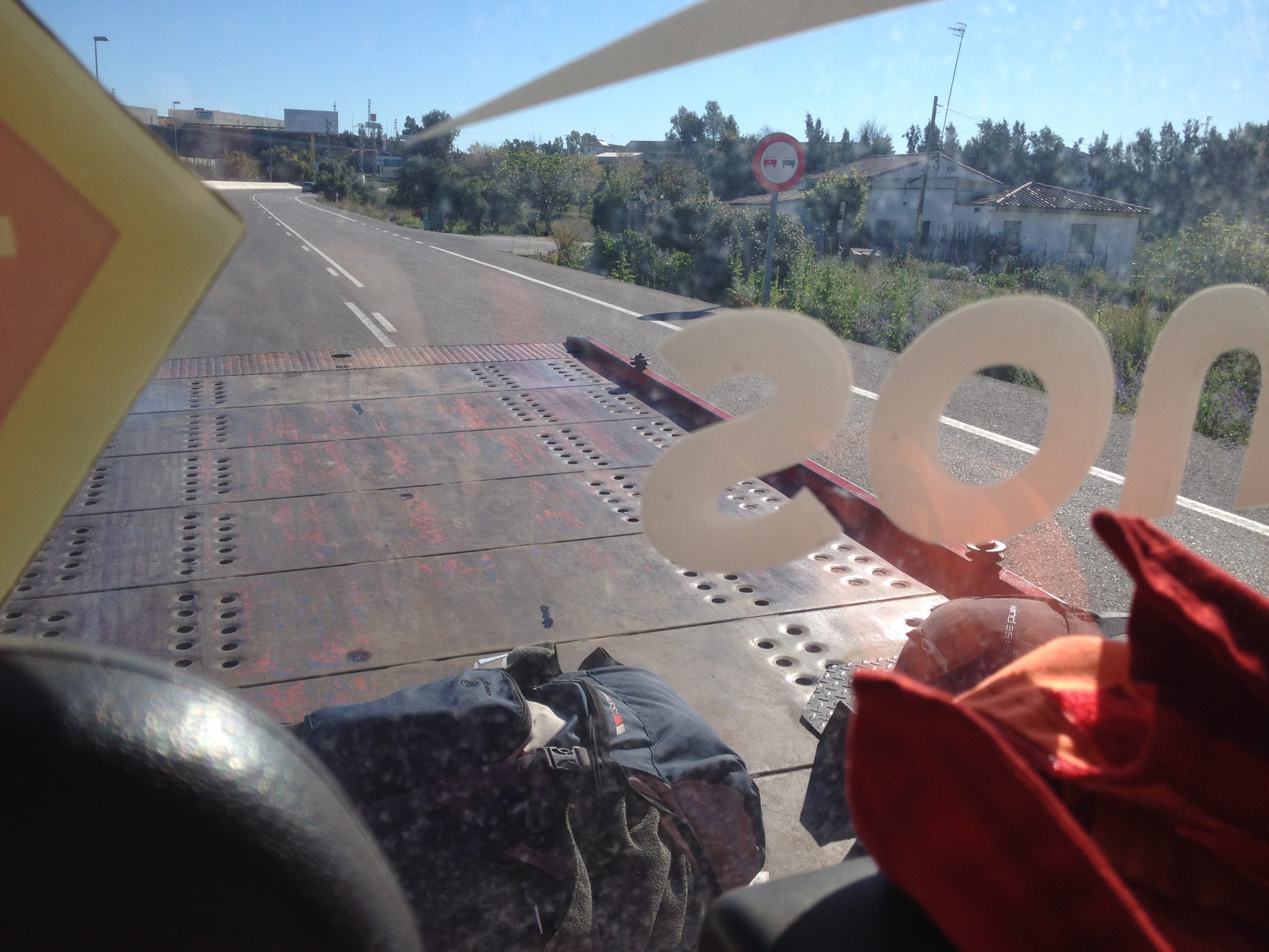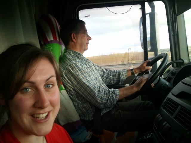 Hitch #24: Fernando the slightly OCD tidy Portuguese truck driver. Never did we see such a clean, organised truck. He agreed to take us all the way to Valladolid, Northern Spain. Now, the truck only had one seat – so we alternated with one us sitting on the floor!