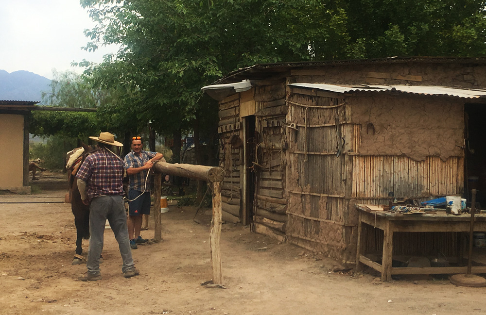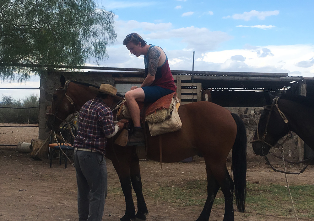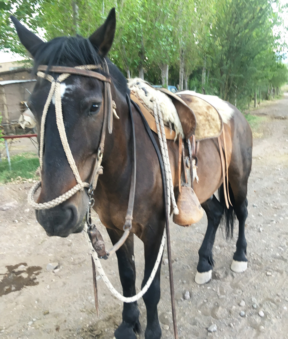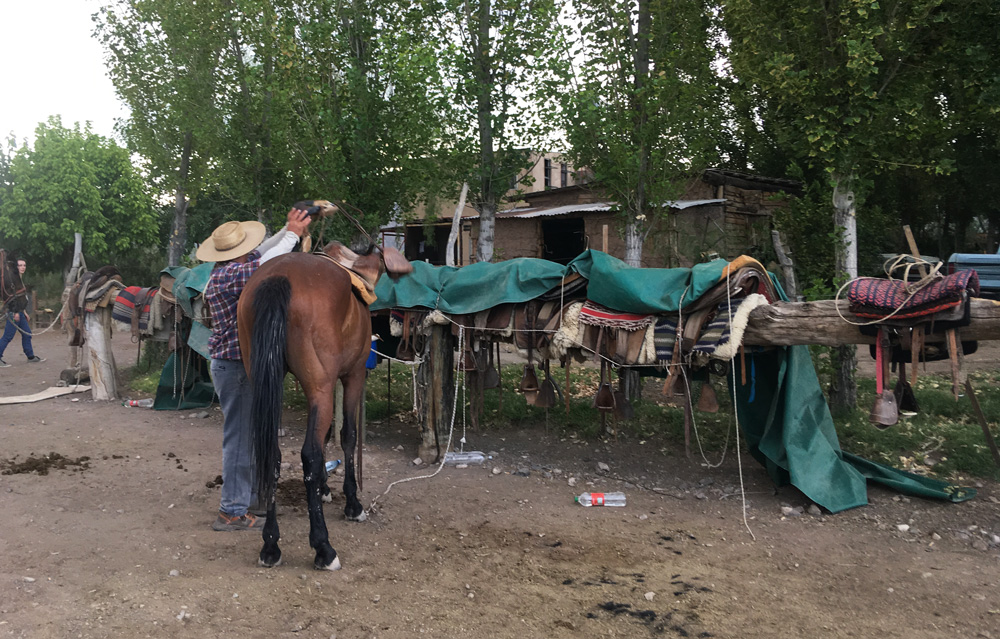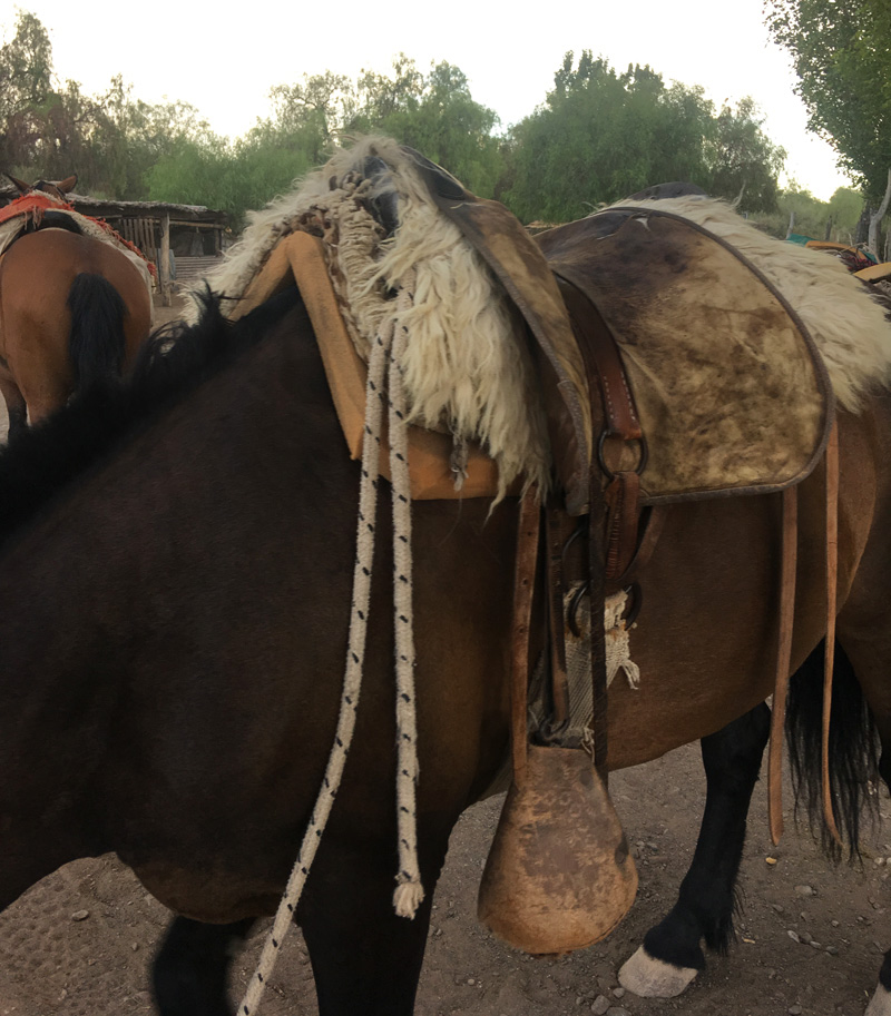 Having dried off and laced up my hiking boots, we were shown over to the rough stables where 5 horses were being tacted up with simple saddles, layered with pieces of foam. Our guide, Alejandro, had a classic Argentine gaucho look about him – wide-brimmed hat, tight slacks and pointed boots.
