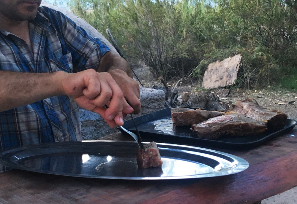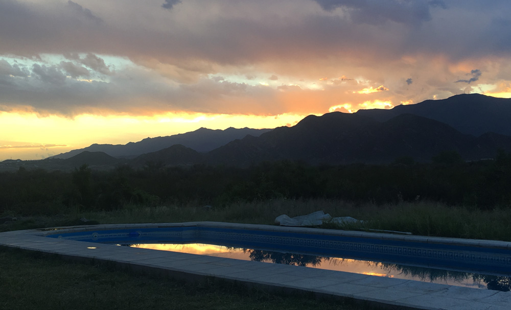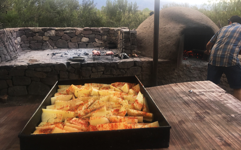Thankfully, the rain held off and we soaked our weary feet into the swimming pool, as the family begin to prepare a traditional Argentine asado, salted beef which is then barbecued over a wood fire. A metal tray brimming with potato wedges is also pushed into the flames.