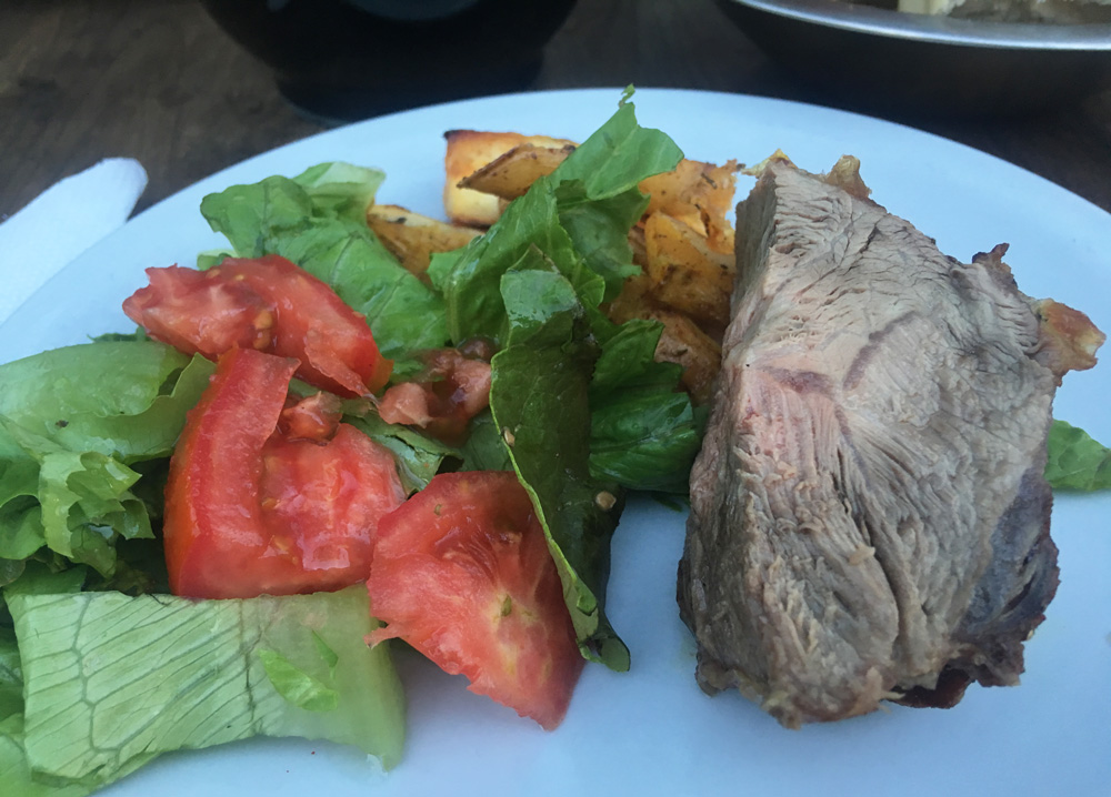 After an hour or so, we are called to the table where a simple green salad and crusty bread had been added to accompany the chunky pieces of beef which were being carved up on the table.