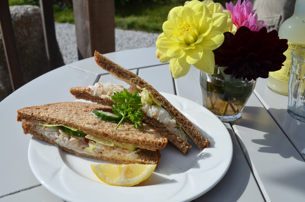True to our word, we popped in to see the lady at Island Fish and I couldn’t resist a cheeky crab sandwich, enjoyed on the outside table decorated by locally grown dahlias.