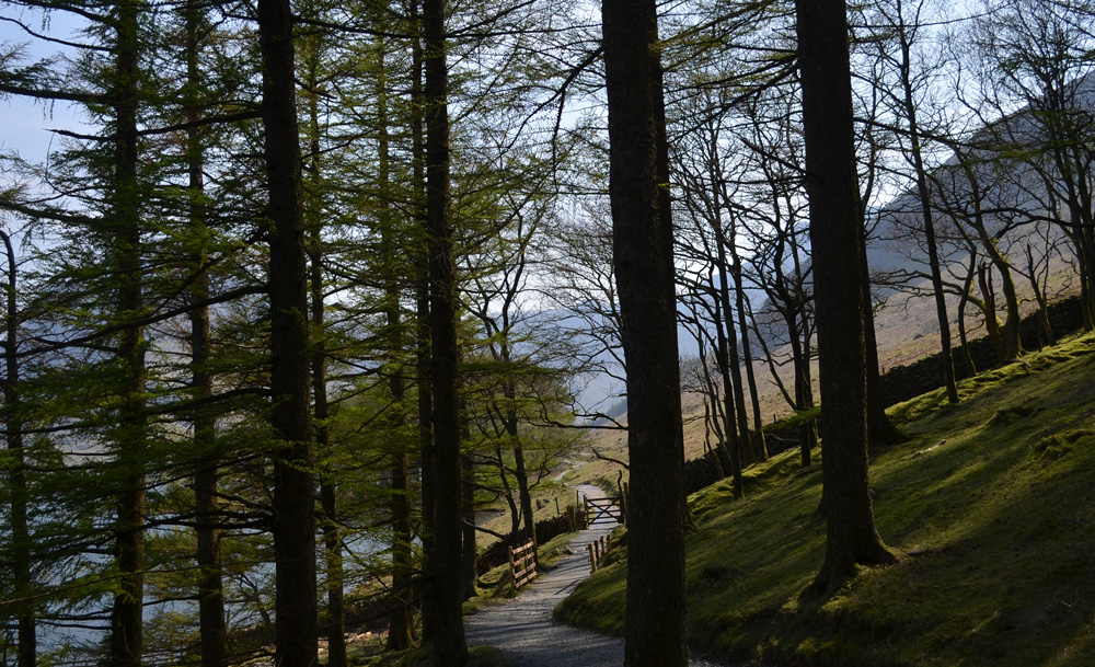 The path then flattens out for open views of the lake before heading into Burtness Wood, all dark and forboding, the smell of pine punctuating the spring air.