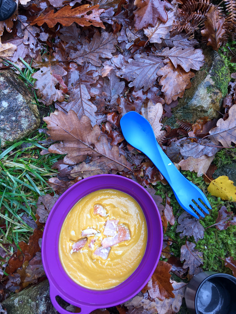 One of the things I love about hiking in autumn and winter is bringing a flask with me, either hot chocolate or homemade soup, to warm up on the chilly days. This was early November, and I used our Halloween pumpkin and packed a little container of parmesan to sprinkle on and sat by a waterfall sheltering from the intermittent showers, fully enjoying the changeable weather.